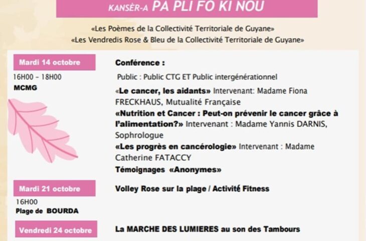 Pour Octobre Rose, la Collectivité territoriale de Guyane propose un ensemble d’actions du 14 au 24 octobre 2025. Lors de la conférence du mardi 14 octobre à la Maison des Cultures et des Mémoires, une présentation sera réalisée par Fiona FRACKHAUS enseignante APA à la Mutualité Française de Guyane.
